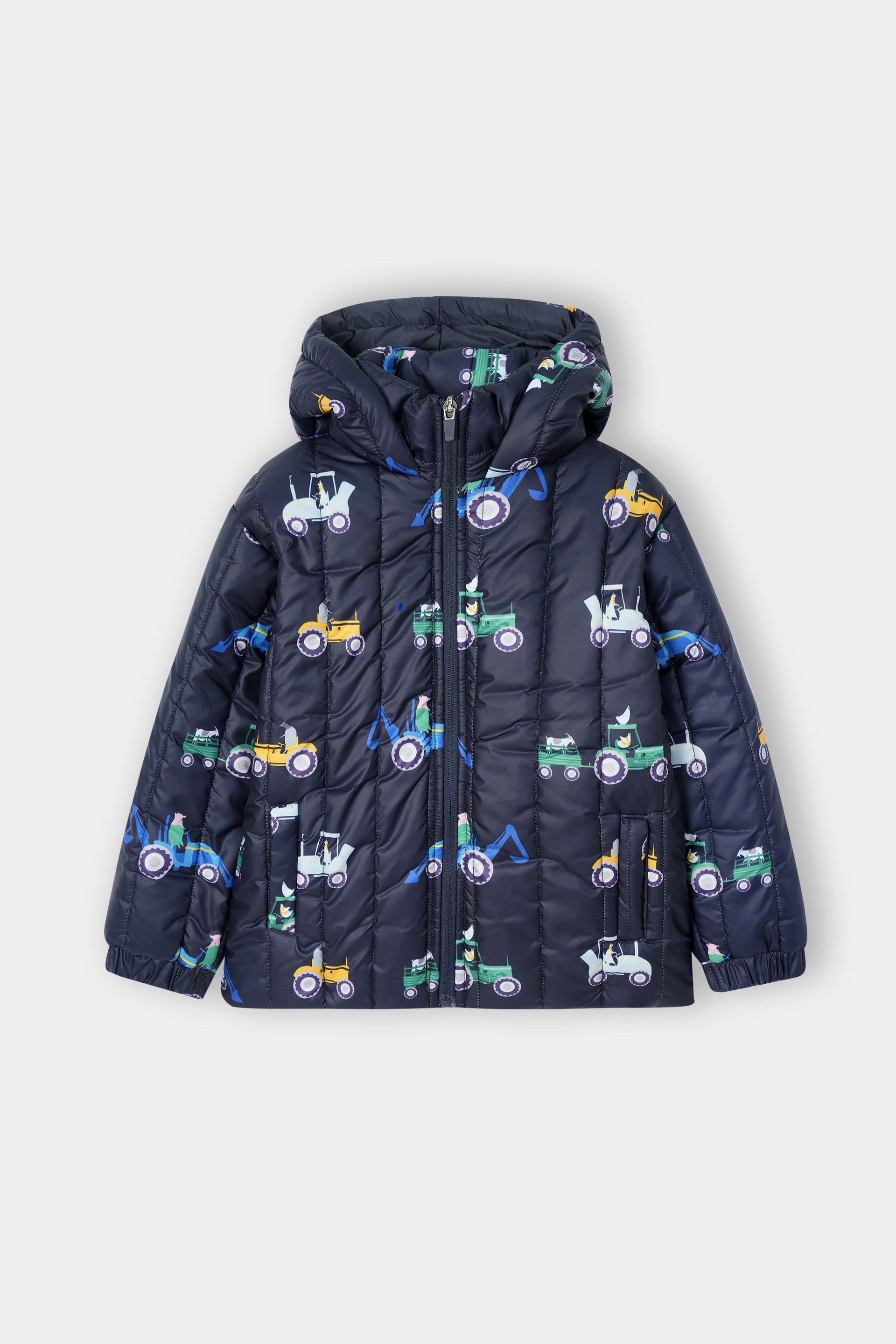 Add fun and warmth to your child’s winter wardrobe with this charming quilted puffer jacket featuring a playful tractor print. The dark navy background enhances the colorful vehicle motifs, making it a standout piece for everyday wear.