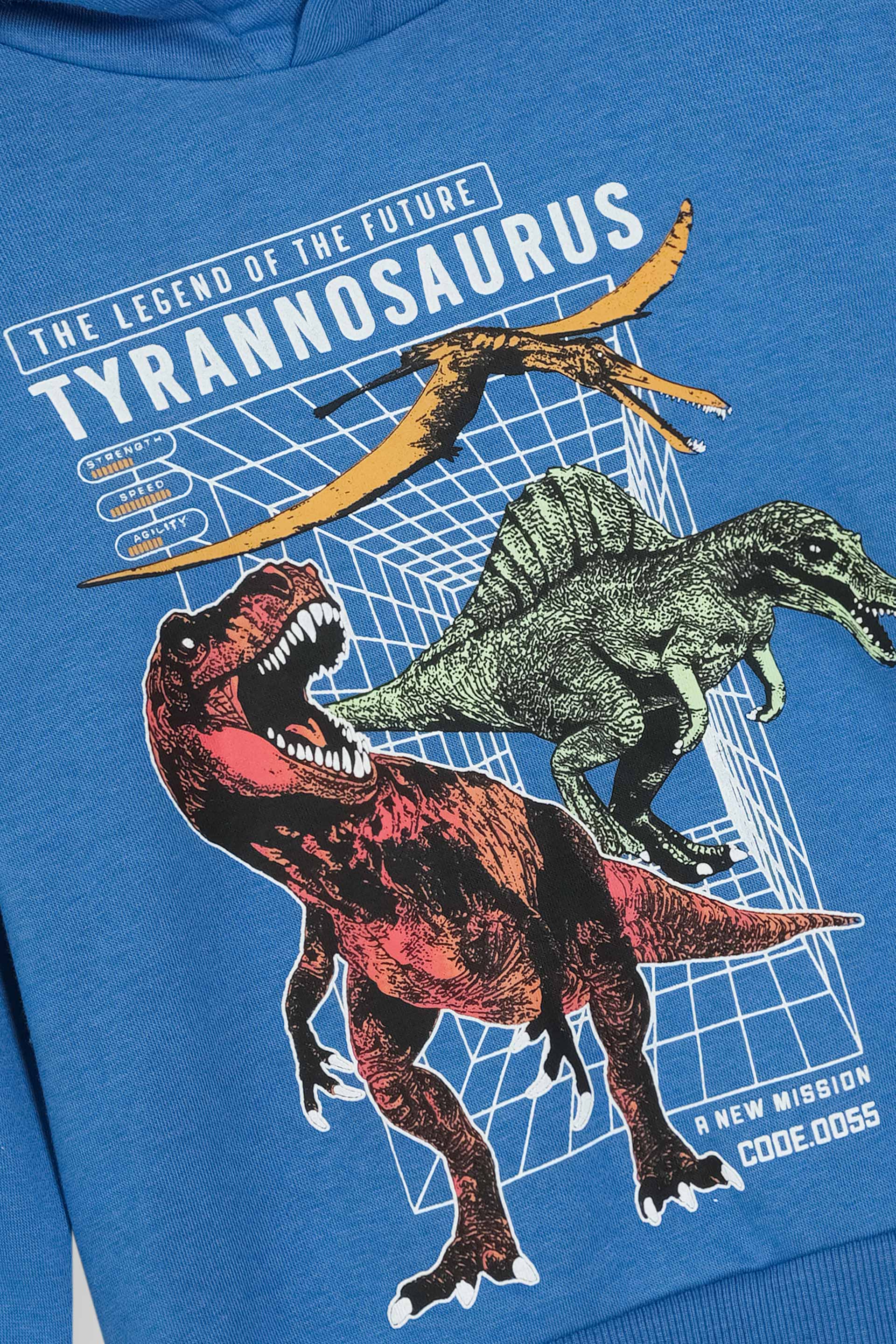 This boys' blue pullover hoodie features a striking Tyrannosaurus graphic, combining playful design with comfortable wear. Crafted for ease of movement and warmth, its pullover style ensures a snug fit while adding fun to everyday outfits. Ideal for young dinosaur enthusiasts, it delivers both style and practicality for casual, active days.
