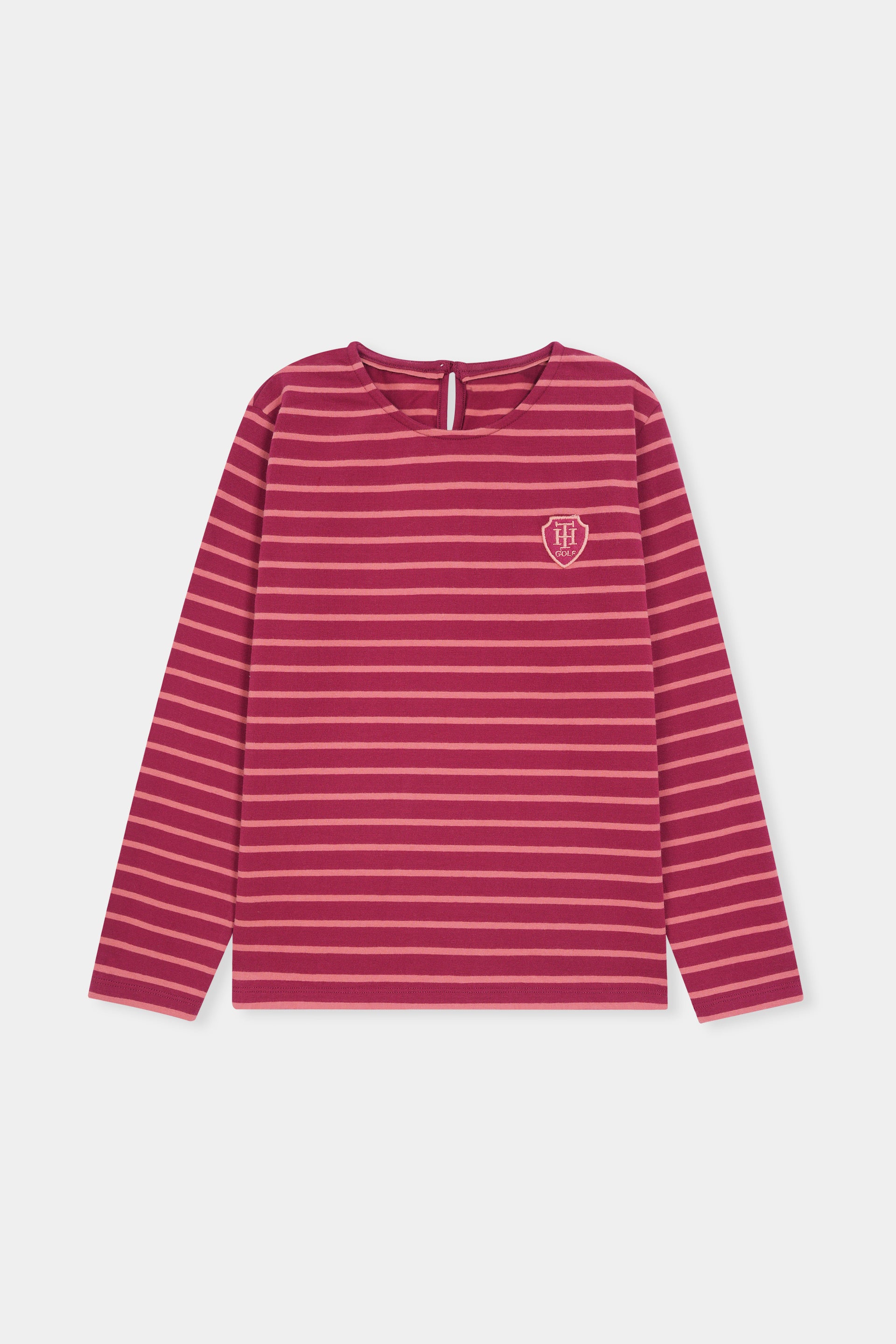 Add a touch of timeless style to your everyday wardrobe with this chic striped long-sleeve top. Featuring a rich dark pink base with soft light pink horizontal stripes, this piece combines comfort with effortless elegance. The embroidered crest detail on the chest adds a sporty, refined touch, while the back keyhole button closure brings subtle sophistication.