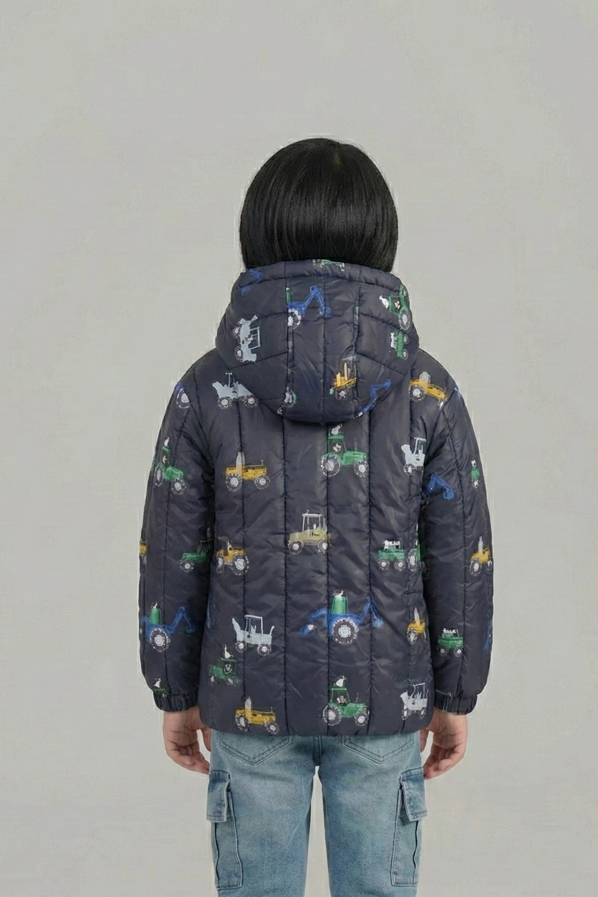 Add fun and warmth to your child’s winter wardrobe with this charming quilted puffer jacket featuring a playful tractor print. The dark navy background enhances the colorful vehicle motifs, making it a standout piece for everyday wear.